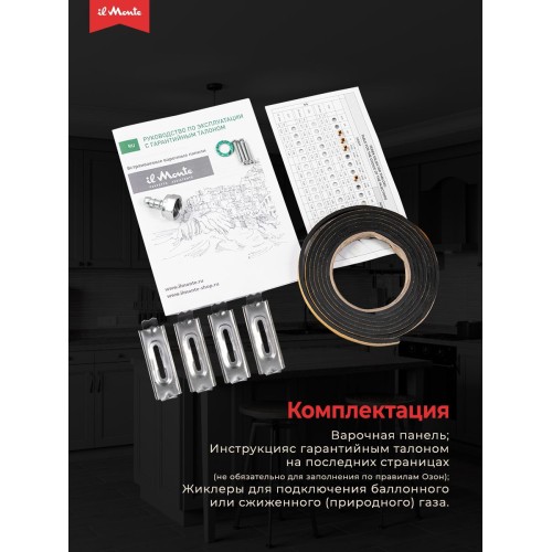 | Комплектация | Варочная панель; Инструкция с гарантийным талоном на последних страницах (не обязательно для заполнения по правилам Озон); Жиклеры для подключения баллонного или сжиженного (природного) газа. |