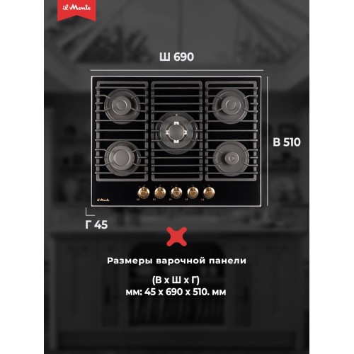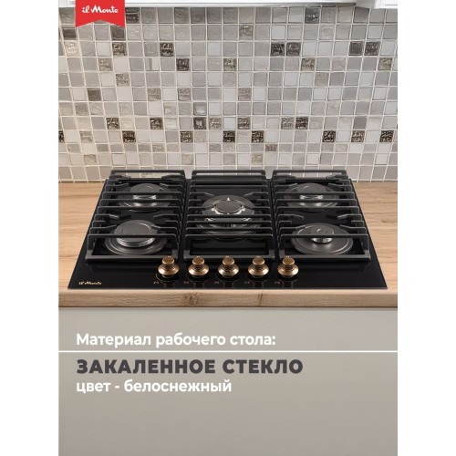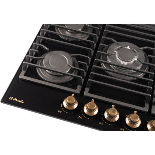 | Название | Варочная панель газовая, Закаленное стекло, 70 см., Газ-контроль, Чугунные решетки, il Monte BH-712G-RUSTICO |