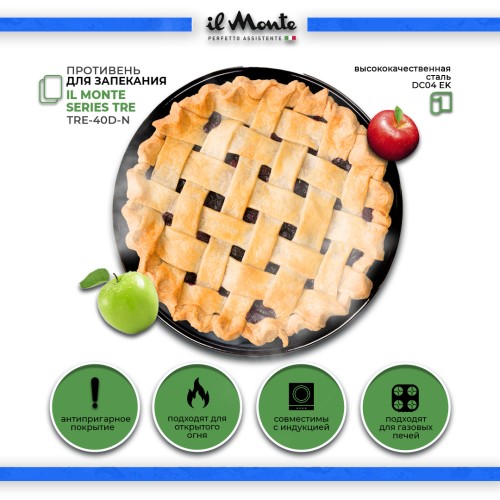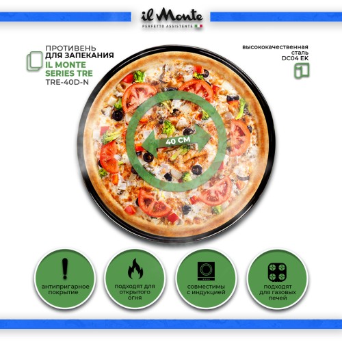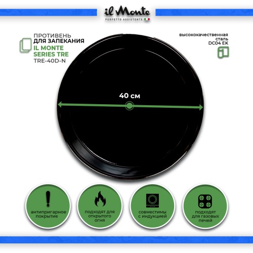Название Противень для духовки, Жаропрочный, Эмалированная сталь, Диаметр внешний 40 см, il Monte TRE-40D-N