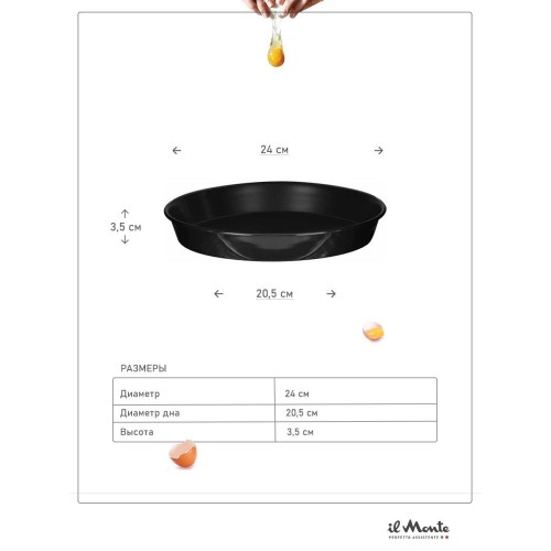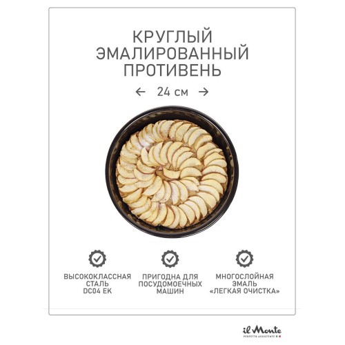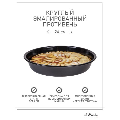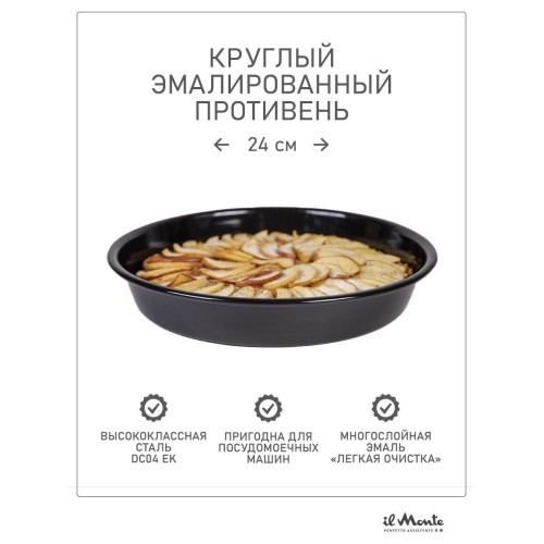 | Название | Противень для духовки, Жаропрочный, Эмалированная сталь, Диаметр внешний 24 см, il Monte TRE-24D-N |