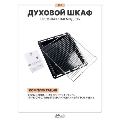 | Комплектация | Духовой шкаф; Хромированная решетка - 1 шт; Прямоугольный противень - 2 шт; Инструкция с гарантийным талоном на последних страницах (не обязательно для заполнения по правилам Озон) |