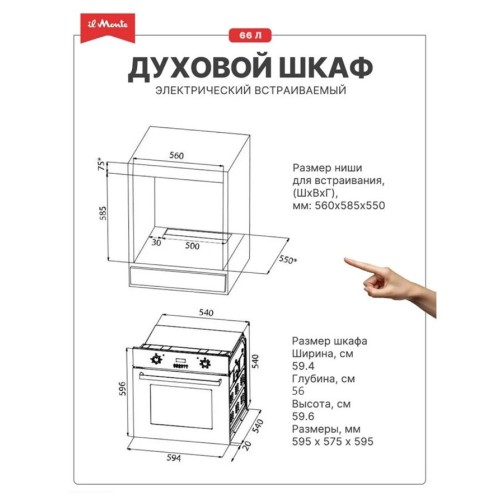 | Название | Встраиваемый духовой шкаф электрический 56л., Конвекция,Таймер с автоотключением духовки, от 80 до 250С., il Monte BO-66 WHITE |